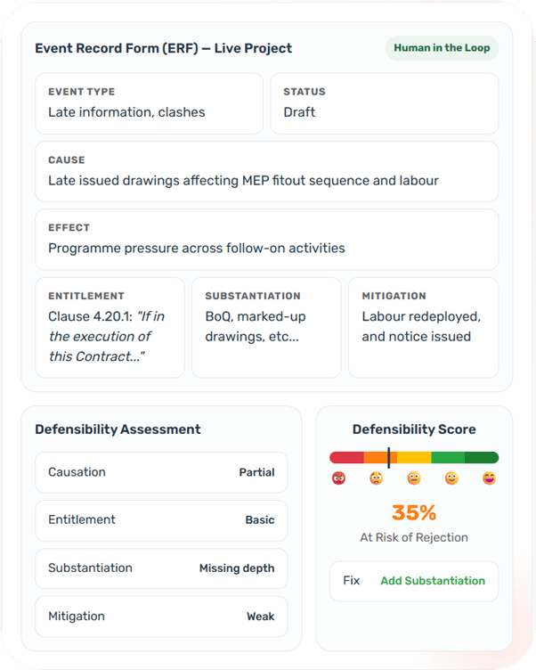 I built this tool using my background in Quantity Surveying, Forensic Expert Witness, and Dispute Resolution to evaluate how your claim position holds up against commercial pressure and the industry’s toughest critics.